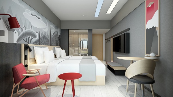 為了滿足新一代消費者的審美需求,新U5特別聯手國外知名設計團隊來打造國際化的時尚外觀,在減少傳統品牌色紅色的基礎上,融入了商務灰和原木色,凸顯品質感,此外,酒店各個空間內均選用了設計感十足的插畫,進一步豐富了年輕活力的形象。