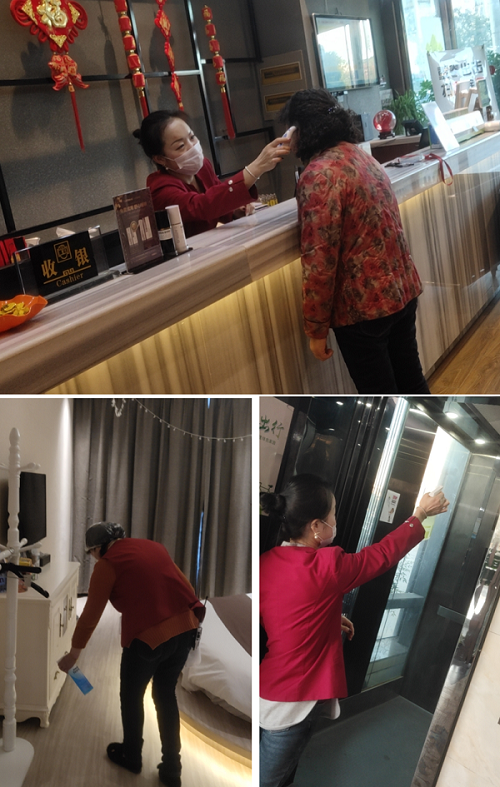 為了保障每一位客人的健康安全,宋廣霞嚴密細致登記住客信息,仔細觀察在店客人健康狀況,配備測溫儀、一次性口罩、酒精、消毒液、殺菌洗手液等物資,實施班前檢查,查體溫、查個人衛生,全體員工佩戴口罩上崗;嚴格做好公共區域、酒店用具、出入口、門把手、電梯按鍵的消毒工作;利用培訓會普及病毒防疫知識,讓員工做好自我防護,具備疫情病癥的鑒別能力,確保自身、住客安全,堅決守護酒店衛生。